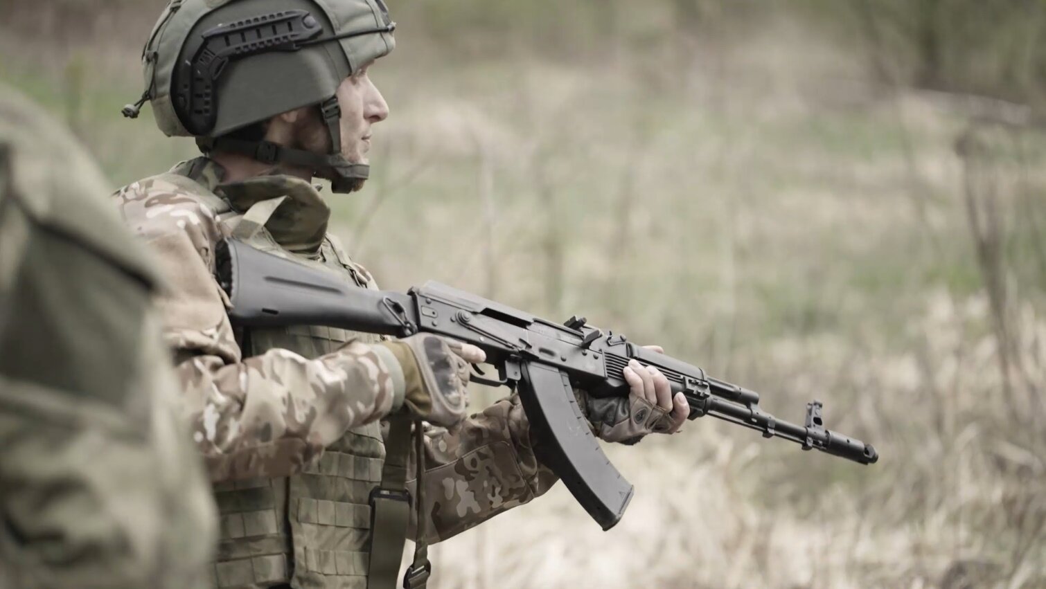 Легендарный боец СВО Закарья Алиев с автоматом Калашникова / Кадр из документального фильма RTД «Один. Поле. Воин…»
